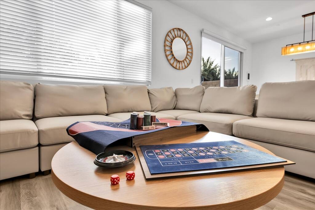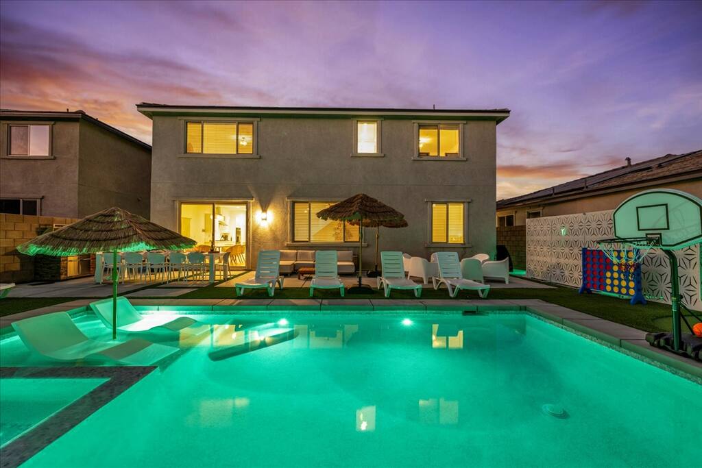 Bella Coachella is the perfect place to enjoy a weekend of fun with your friends and family. This spacious home sleeps up to 24 people with 8 bedrooms. The backyard is equipped with a brand new pool and spa, billiards table,BBQ, firepit, outdoor dining, and ample games. Please note, pool heating costs $150/ day and we need at least 24 hours notice before your arrival. Spa heating is complementary during your stay.
