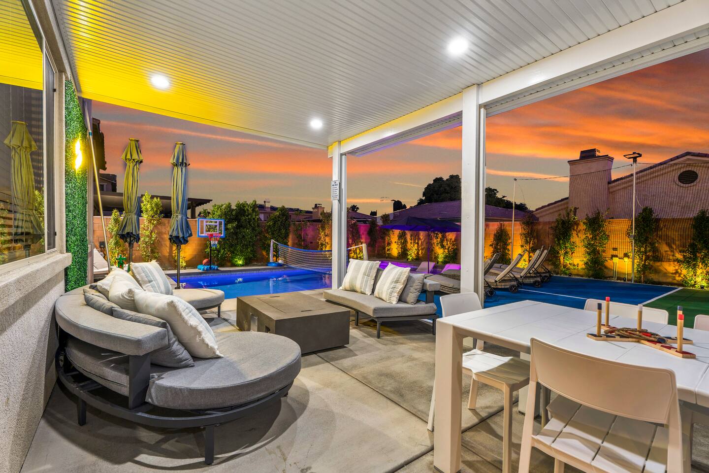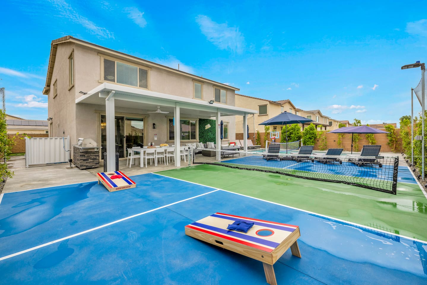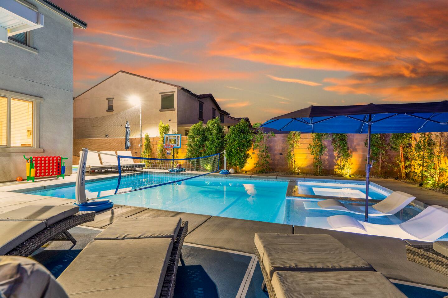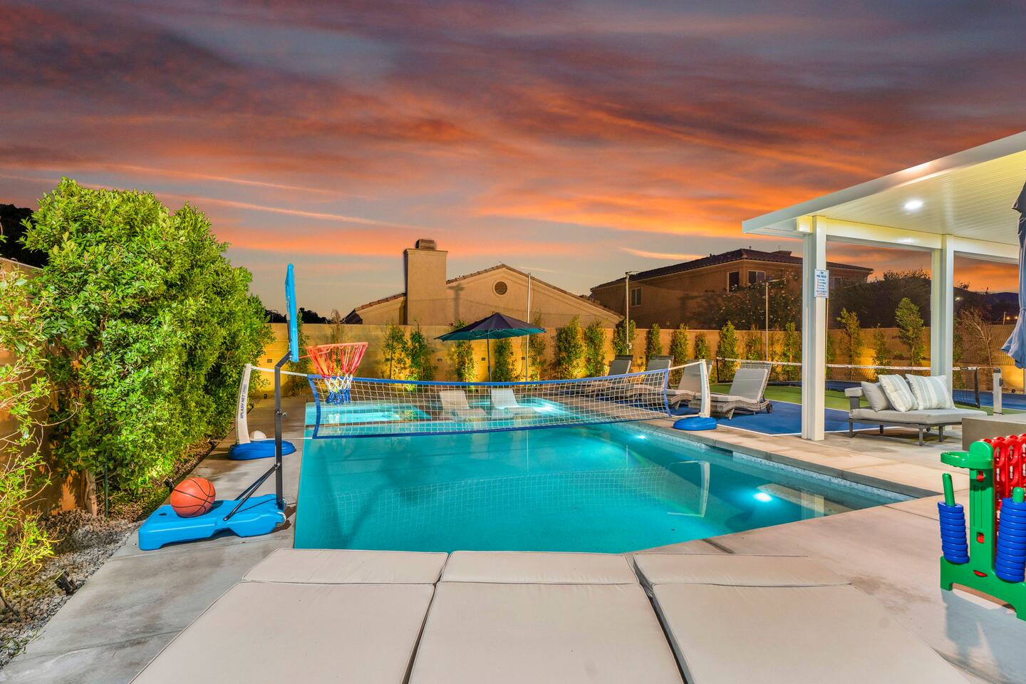- 8 bedrooms, sleeps up to 23 people - Resort-style pool & spa - Covered patio with outdoor dining - Stainless steel BBQ - Loungers perfect for enjoying the sun - High-efficiency central AC and central heating - Washer/ dryer - Fast wifi and smart locks for easy check-in + access - Smart tablet to control the pool/ spa - Smart TVs and speakers for indoor music - Comfortable beds - Complimentary coffee, tea, sugar and cooking supplies - Parking available in the driveway and on the street. Please note: the garage has been turned into a game room and is not available for parking. LIVING ROOM, KITCHEN, AND DINING ROOM Enjoy an open concept space with beautiful views and lots of counter space and a large dining table to enjoy your meals at. The living room is equipped with a spacious and comfortable couch, smart tv, speakers, and easy access to the backyard. The kitchen has a standard ground coffee maker available for use during your stay. There is also a desk in this space you’re welcome to use for working from home. OUTDOOR SPACE The resort style pool and spa is brand new. The covered patio includes an outdoor dining table and fire pit. The backyard also includes a BBQ, lounge chairs, pickleball court, pool basketball hoop, pool volleyball net, mini basketball court, putting green, corn hole, connect four, and ring toss. GARAGE GAME ROOM The game room includes a ping pong table, foosball table and air hockey table. DOWNSTAIRS Bedroom 1 - 2 full beds Bedroom 2 - 1 king bed + 1 rollaway bed Bathroom 1 - shower with tub UPSTAIRS Bedroom 3 - 3 full sized bunk beds (6 beds total) Bathroom 2 - shower with tub Bedroom 4 - 2 twin beds Bedroom 5 - 2 full beds Bedroom 6 - 1 king bed Bathroom 3 - shower + tub Bedroom 7 (Primary) - 1 king bed Bathroom 4 - ensuite in primary room including shower and XL tub Bedroom 8 - 1 twin OCCUPANCY 23 guests maximum PETS Our general rule is that we do not allow dogs or pets but can make an exception for small dogs for an additional $100 pet fee per pet. POOL & SPA Pool heating - $150 per day Spa heating - complimentary Pool is 6-8 ft deep in the deep end No glassware by the pool. We have provided ample outdoor drinkware, please use it! No diving, no lifeguard on duty; guests assume their own risk PARKING Free parking available in the driveway and on the street. No indoor garage parking allowed due to the gameroom. The garage has a 240 V outlet to charge electric vehicles. You must bring your own charger. SECURITY CAMERAS For the safety of our property, we have outdoor security cameras in the front and side yard of the property. These are live recordings and we do monitor. Please message us if you have any additional questions. HOUSE RULES - No parties; violations will be notified to property manager and a $200 clean up fee will be charged - No parking in the garage, this is a dedicated game room and any furniture should not be moved. - Quiet hours start at 9:00pm. - 23 guests maximum; additional guests by approval will result in a fee - No glassware by the pool. We have provided ample outdoor drinkware, please use it! - Generally we do not allow pets but can accommodate small dogs for an additional $150 fee per pet. -Pool heating fee:$150 per day.Please request at least 24 hours in advance. Other details to note This house is privately owned and managed; the owners assume no liability for any accidents, injuries or illness that occur while on the premises or its facilities. The homeowners are not responsible for the loss of personal belongings or valuables of the guest. It is agreed that all guests are expressly assuming the risk of any harm arising from their use of the premises. Guests should be aware that the pool, spa, and surrounding patios can be dangerous.