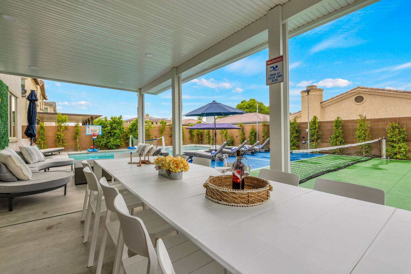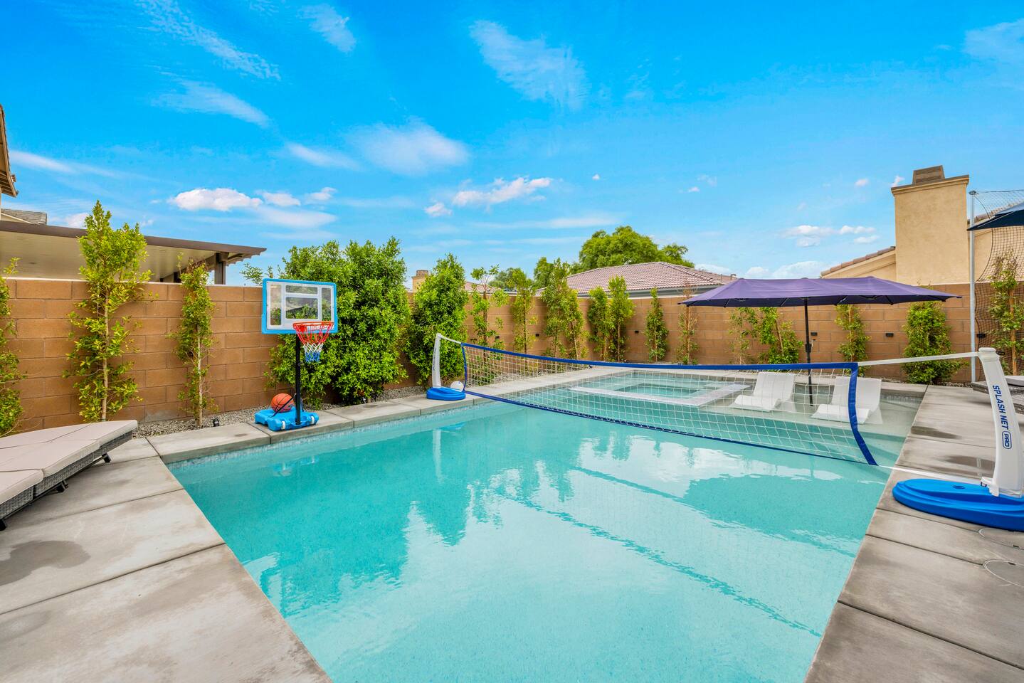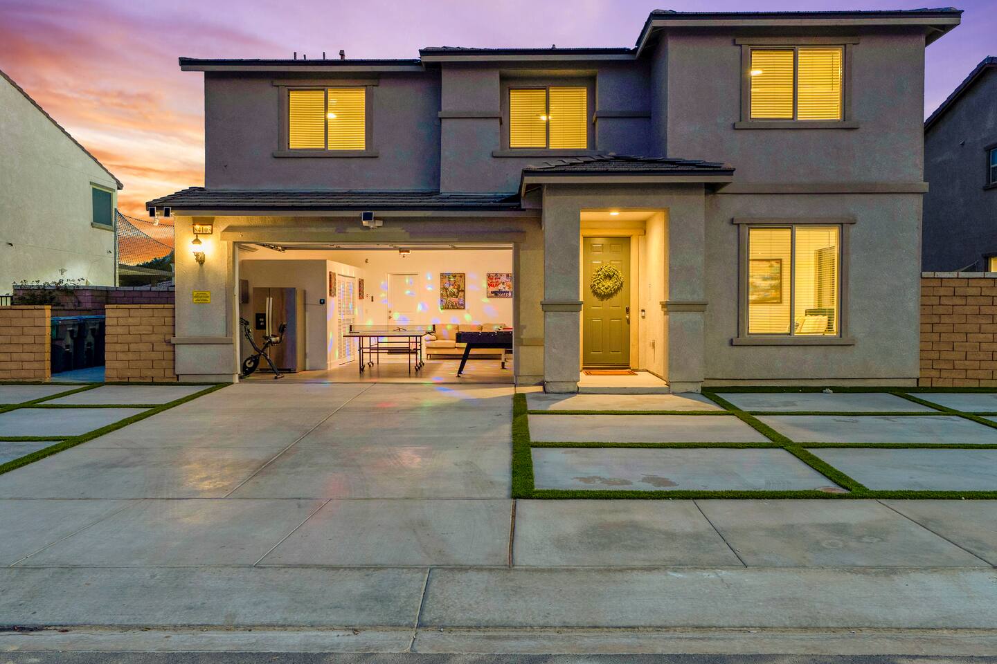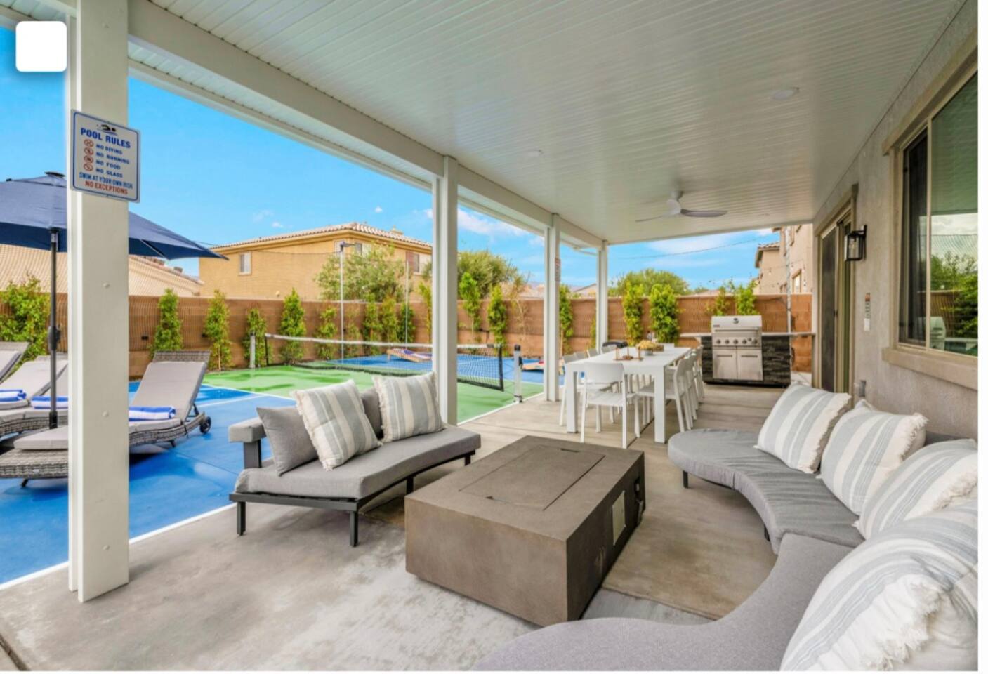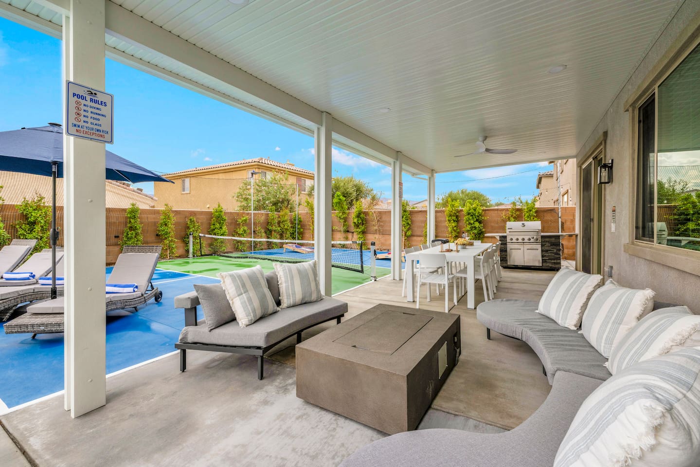 - 8 bedrooms, sleeps up to 23 people - Resort-style pool & spa - Covered patio with outdoor dining - Stainless steel BBQ - Loungers perfect for enjoying the sun - High-efficiency central AC and central heating - Washer/ dryer - Fast wifi and smart locks for easy check-in + access - Smart tablet to control the pool/ spa - Smart TVs and speakers for indoor music - Comfortable beds - Complimentary coffee, tea, sugar and cooking supplies - Parking available in the driveway and on the street. Please note: the garage has been turned into a game room and is not available for parking. LIVING ROOM, KITCHEN, AND DINING ROOM Enjoy an open concept space with beautiful views and lots of counter space and a large dining table to enjoy your meals at. The living room is equipped with a spacious and comfortable couch, smart tv, speakers, and easy access to the backyard. The kitchen has a standard ground coffee maker available for use during your stay. There is also a desk in this space you’re welcome to use for working from home. OUTDOOR SPACE The resort style pool and spa is brand new. The covered patio includes an outdoor dining table and fire pit. The backyard also includes a BBQ, lounge chairs, pickleball court, pool basketball hoop, pool volleyball net, mini basketball court, putting green, corn hole, connect four, and ring toss. GARAGE GAME ROOM The game room includes a ping pong table, foosball table and air hockey table. DOWNSTAIRS Bedroom 1 - 2 full beds Bedroom 2 - 1 king bed + 1 rollaway bed Bathroom 1 - shower with tub UPSTAIRS Bedroom 3 - 3 full sized bunk beds (6 beds total) Bathroom 2 - shower with tub Bedroom 4 - 2 twin beds Bedroom 5 - 2 full beds Bedroom 6 - 1 king bed Bathroom 3 - shower + tub Bedroom 7 (Primary) - 1 king bed Bathroom 4 - ensuite in primary room including shower and XL tub Bedroom 8 - 1 twin OCCUPANCY 23 guests maximum PETS Our general rule is that we do not allow dogs or pets but can make an exception for small dogs for an additional $100 pet fee per pet. POOL & SPA Pool heating - $150 per day Spa heating - complimentary Pool is 6-8 ft deep in the deep end No glassware by the pool. We have provided ample outdoor drinkware, please use it! No diving, no lifeguard on duty; guests assume their own risk PARKING Free parking available in the driveway and on the street. No indoor garage parking allowed due to the gameroom. The garage has a 240 V outlet to charge electric vehicles. You must bring your own charger. SECURITY CAMERAS For the safety of our property, we have outdoor security cameras in the front and side yard of the property. These are live recordings and we do monitor. Please message us if you have any additional questions. HOUSE RULES - No parties; violations will be notified to property manager and a $200 clean up fee will be charged - No parking in the garage, this is a dedicated game room and any furniture should not be moved. - Quiet hours start at 9:00pm. - 23 guests maximum; additional guests by approval will result in a fee - No glassware by the pool. We have provided ample outdoor drinkware, please use it! - Generally we do not allow pets but can accommodate small dogs for an additional $150 fee per pet. -Pool heating fee:$150 per day.Please request at least 24 hours in advance. Other details to note This house is privately owned and managed; the owners assume no liability for any accidents, injuries or illness that occur while on the premises or its facilities. The homeowners are not responsible for the loss of personal belongings or valuables of the guest. It is agreed that all guests are expressly assuming the risk of any harm arising from their use of the premises. Guests should be aware that the pool, spa, and surrounding patios can be dangerous.