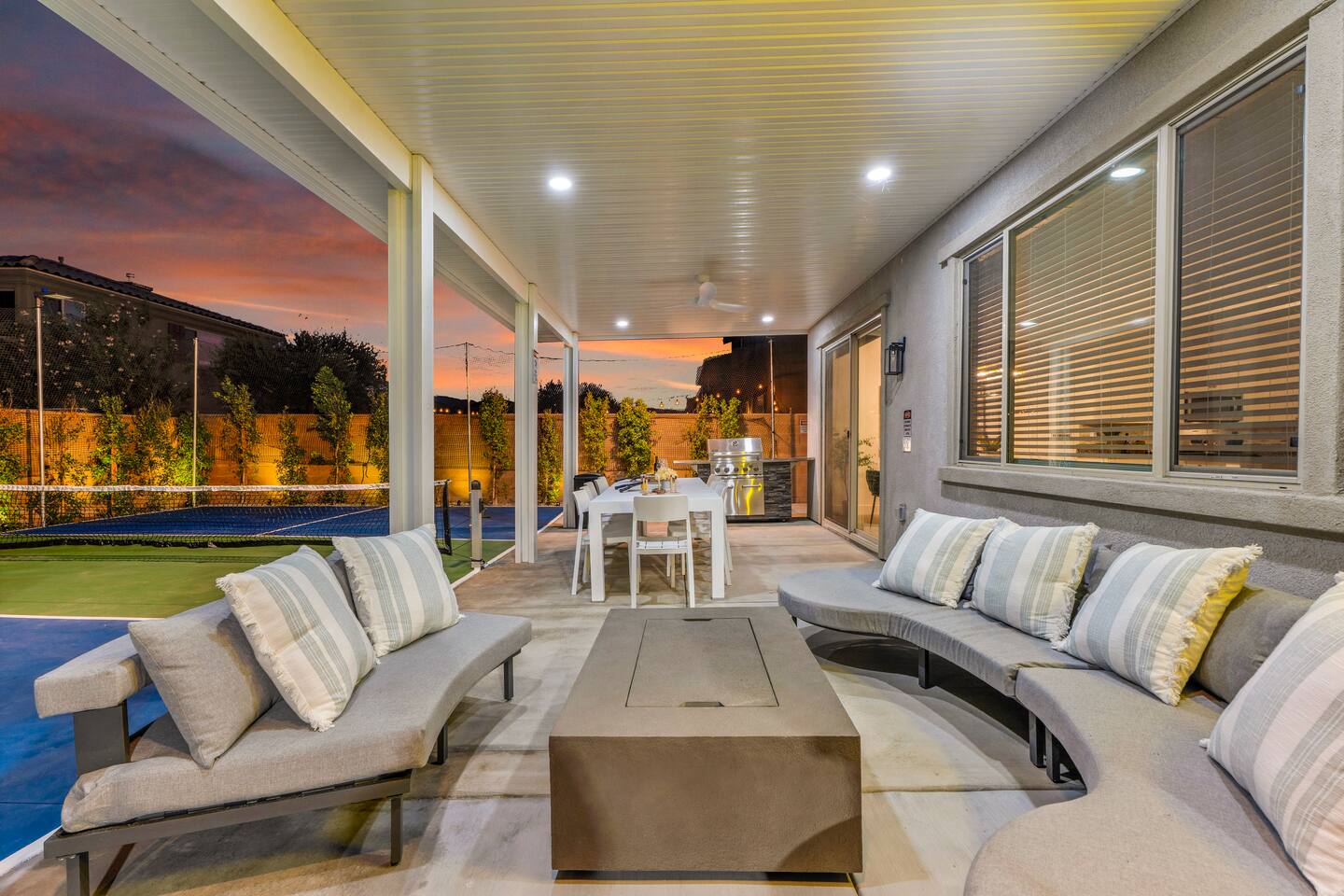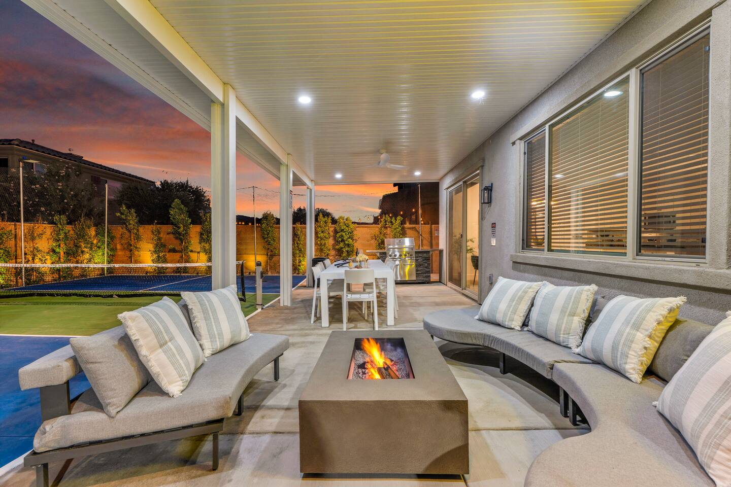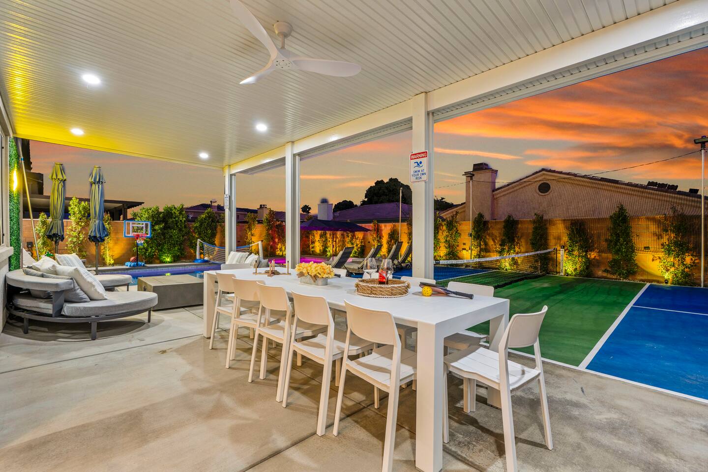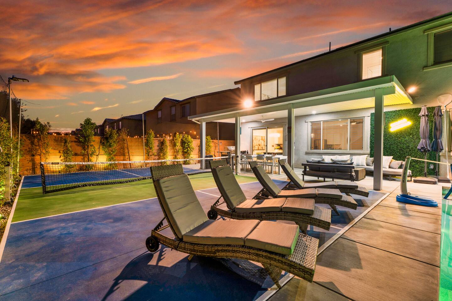 - 8 bedrooms, sleeps up to 23 people - Resort-style pool & spa - Covered patio with outdoor dining - Stainless steel BBQ - Loungers perfect for enjoying the sun - High-efficiency central AC and central heating - Washer/ dryer - Fast wifi and smart locks for easy check-in + access - Smart tablet to control the pool/ spa - Smart TVs and speakers for indoor music - Comfortable beds - Complimentary coffee, tea, sugar and cooking supplies - Parking available in the driveway and on the street. Please note: the garage has been turned into a game room and is not available for parking. LIVING ROOM, KITCHEN, AND DINING ROOM Enjoy an open concept space with beautiful views and lots of counter space and a large dining table to enjoy your meals at. The living room is equipped with a spacious and comfortable couch, smart tv, speakers, and easy access to the backyard. The kitchen has a standard ground coffee maker available for use during your stay. There is also a desk in this space you’re welcome to use for working from home. OUTDOOR SPACE The resort style pool and spa is brand new. The covered patio includes an outdoor dining table and fire pit. The backyard also includes a BBQ, lounge chairs, pickleball court, pool basketball hoop, pool volleyball net, mini basketball court, putting green, corn hole, connect four, and ring toss. GARAGE GAME ROOM The game room includes a ping pong table, foosball table and air hockey table. DOWNSTAIRS Bedroom 1 - 2 full beds Bedroom 2 - 1 king bed + 1 rollaway bed Bathroom 1 - shower with tub UPSTAIRS Bedroom 3 - 3 full sized bunk beds (6 beds total) Bathroom 2 - shower with tub Bedroom 4 - 2 twin beds Bedroom 5 - 2 full beds Bedroom 6 - 1 king bed Bathroom 3 - shower + tub Bedroom 7 (Primary) - 1 king bed Bathroom 4 - ensuite in primary room including shower and XL tub Bedroom 8 - 1 twin OCCUPANCY 23 guests maximum PETS Our general rule is that we do not allow dogs or pets but can make an exception for small dogs for an additional $100 pet fee per pet. POOL & SPA Pool heating - $150 per day Spa heating - complimentary Pool is 6-8 ft deep in the deep end No glassware by the pool. We have provided ample outdoor drinkware, please use it! No diving, no lifeguard on duty; guests assume their own risk PARKING Free parking available in the driveway and on the street. No indoor garage parking allowed due to the gameroom. The garage has a 240 V outlet to charge electric vehicles. You must bring your own charger. SECURITY CAMERAS For the safety of our property, we have outdoor security cameras in the front and side yard of the property. These are live recordings and we do monitor. Please message us if you have any additional questions. HOUSE RULES - No parties; violations will be notified to property manager and a $200 clean up fee will be charged - No parking in the garage, this is a dedicated game room and any furniture should not be moved. - Quiet hours start at 9:00pm. - 23 guests maximum; additional guests by approval will result in a fee - No glassware by the pool. We have provided ample outdoor drinkware, please use it! - Generally we do not allow pets but can accommodate small dogs for an additional $150 fee per pet. -Pool heating fee:$150 per day.Please request at least 24 hours in advance. Other details to note This house is privately owned and managed; the owners assume no liability for any accidents, injuries or illness that occur while on the premises or its facilities. The homeowners are not responsible for the loss of personal belongings or valuables of the guest. It is agreed that all guests are expressly assuming the risk of any harm arising from their use of the premises. Guests should be aware that the pool, spa, and surrounding patios can be dangerous.