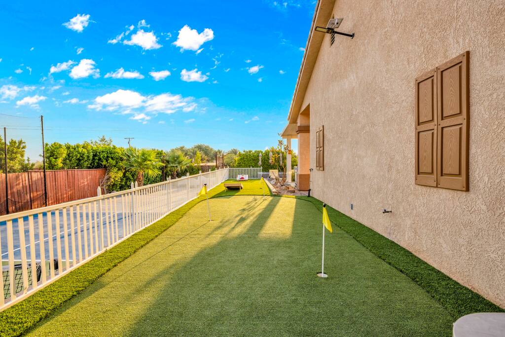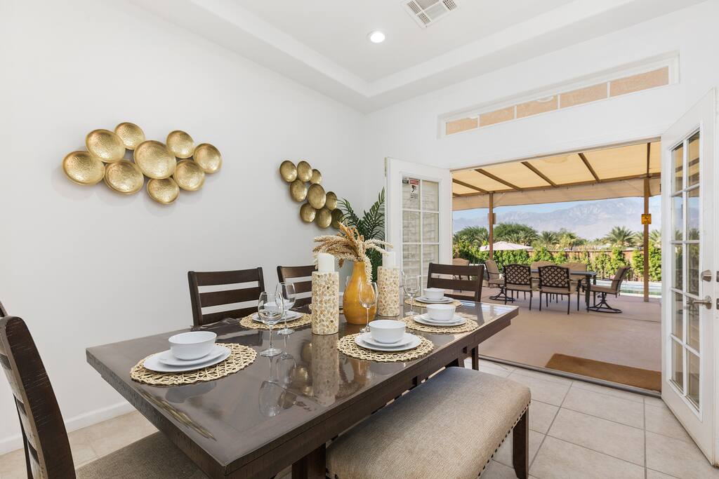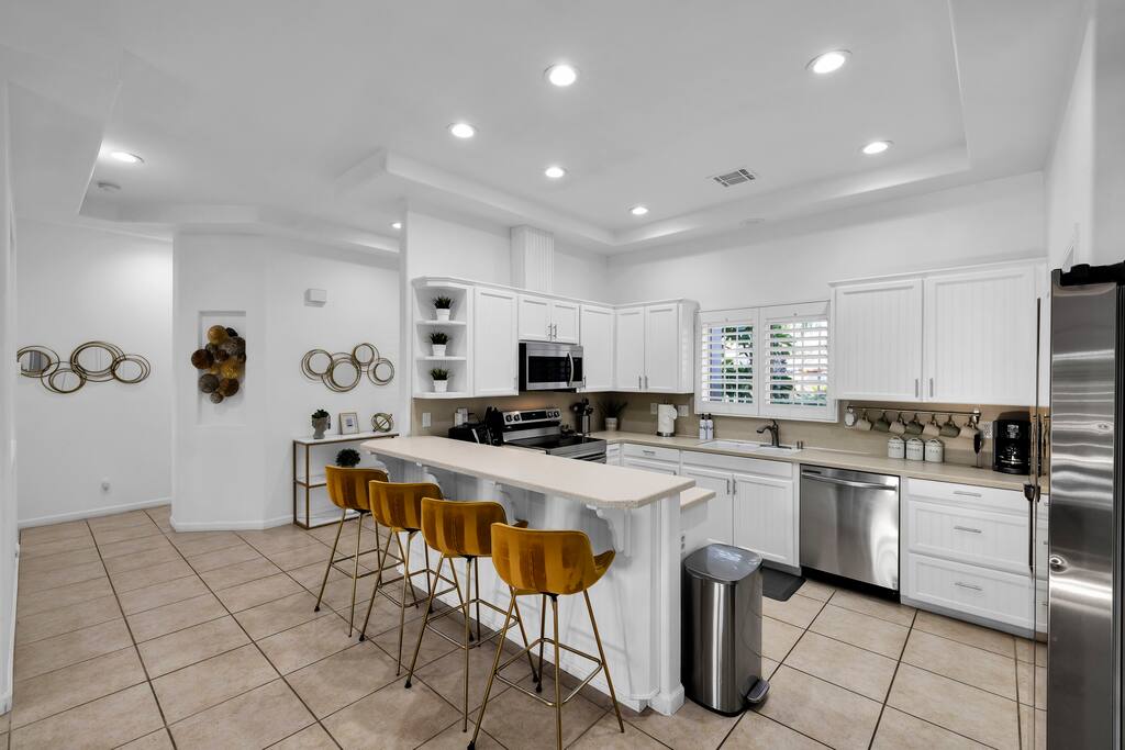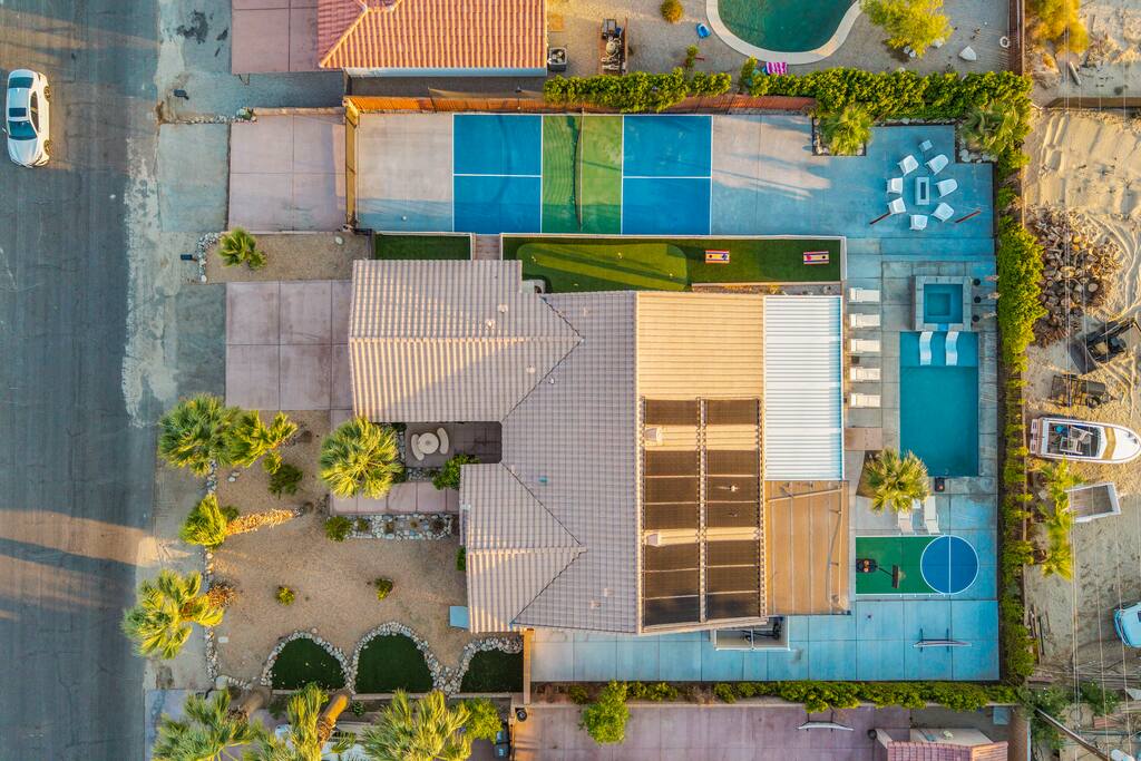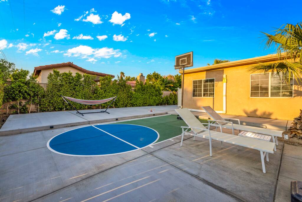 BACKYARD The new backyard includes a pool & spa, covered patio with an outdoor dining table, sofas, BBQ, hammock, firepit, basketball court, pickleball court, putting green, and other games. There are lots of activities to keep your party entertained all day and night. **PLEASE NOTE: The fee to heat the pool is $150/day. Please let us know at least 24 hours in advance of your arrival if you'd like the pool heated. Spa heating is complimentary. KITCHEN The kitchen is fully equipped with a standard ground coffee maker, tea kettle, toaster, blender, and everything you need to cook at home. Kitchen supplies included: coffee, sugar, tea, cooking oil, spices, and plenty of outdoor dinnerware. LIVING ROOM Enjoy an open-concept living room with a large comfortable couch to fit your party, a TV, and a sound bar to play your favorite music. BEDROOMS Please see details of each room below: 1 - 1 king bed, ensuite bathroom 2 - 1 king bed, ensuite bathroom, work-from-home desk 3 - 1 king bed 4 - 4 twin beds, ensuite bathroom + 2 twin folding beds BATHROOMS All three bathrooms include bath towels, hand towels, shampoo, conditioner, and body wash. Additional bath towels can be found under each bathroom sink. HOUSE RULES - No parties; violations will be notified to property manager and a $200 party clean up fee will be charged - Quiet hours start at 10:00 pm - 12 guests maximum - No glassware by the pool. We have provided ample outdoor drinkware, please use it! - We generally do not allow pets. Small dogs are ok for an additional $100 pet fee. Please reach out to hosts for approval - Turn off BBQ and Fire pit propane after each use - Lower umbrellas every day due to winds SECURITY CAMERAS For the safety of our property, we have outdoor security cameras facing the front driveway and front doorbell. These are live recordings and we do monitor. Please message us if you have any questions. This house is privately owned and managed; the owners assume no liability for any accidents, injuries or illness that occur while on the premises or its facilities. The homeowners are not responsible for the loss of personal belongings or valuables of the guest. It is agreed that all guests are expressly assuming the risk of any harm arising from their use of the premises. Guests should be aware that the pool and surrounding patios can be dangerous. Please note, while the house is cleaned regularly before and after each guest, this desert region is known for natural dust storms and strong winds from time to time. These winds may carry a lot of sand that may collect on outdoor furniture overnight. STR#: RVC-1573