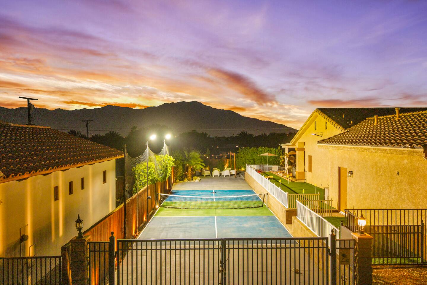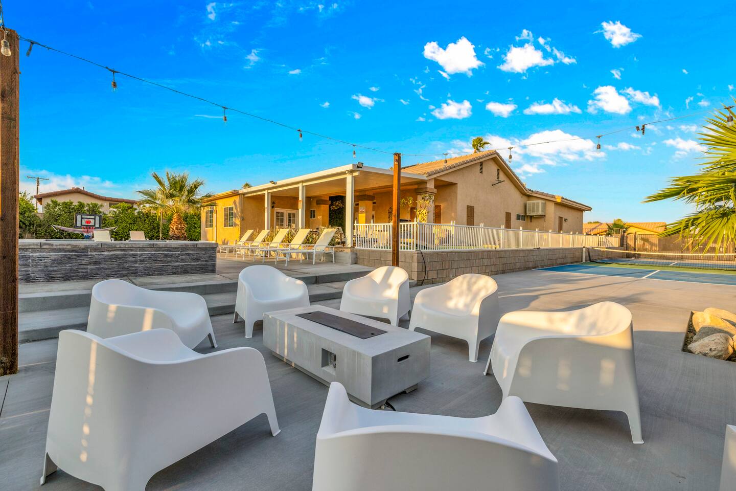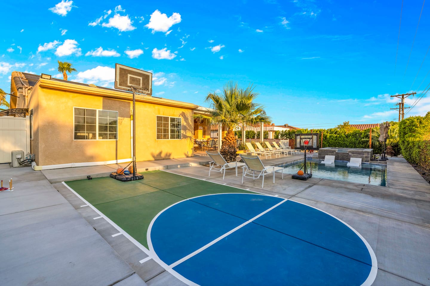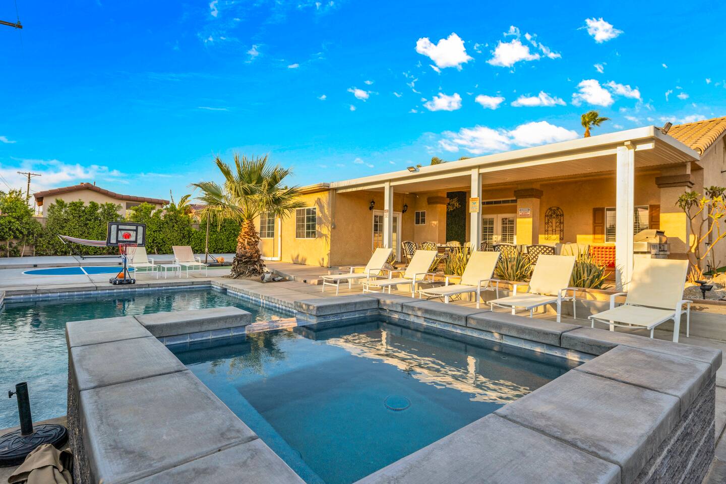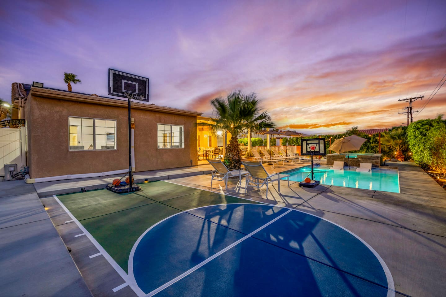 BACKYARD The new backyard includes a pool & spa, covered patio with an outdoor dining table, sofas, BBQ, hammock, firepit, basketball court, pickleball court, putting green, and other games. There are lots of activities to keep your party entertained all day and night. **PLEASE NOTE: The fee to heat the pool is $150/day. Please let us know at least 24 hours in advance of your arrival if you'd like the pool heated. Spa heating is complimentary. KITCHEN The kitchen is fully equipped with a standard ground coffee maker, tea kettle, toaster, blender, and everything you need to cook at home. Kitchen supplies included: coffee, sugar, tea, cooking oil, spices, and plenty of outdoor dinnerware. LIVING ROOM Enjoy an open-concept living room with a large comfortable couch to fit your party, a TV, and a sound bar to play your favorite music. BEDROOMS Please see details of each room below: 1 - 1 king bed, ensuite bathroom 2 - 1 king bed, ensuite bathroom, work-from-home desk 3 - 1 king bed 4 - 4 twin beds, ensuite bathroom + 2 twin folding beds BATHROOMS All three bathrooms include bath towels, hand towels, shampoo, conditioner, and body wash. Additional bath towels can be found under each bathroom sink. HOUSE RULES - No parties; violations will be notified to property manager and a $200 party clean up fee will be charged - Quiet hours start at 10:00 pm - 12 guests maximum - No glassware by the pool. We have provided ample outdoor drinkware, please use it! - We generally do not allow pets. Small dogs are ok for an additional $100 pet fee. Please reach out to hosts for approval - Turn off BBQ and Fire pit propane after each use - Lower umbrellas every day due to winds SECURITY CAMERAS For the safety of our property, we have outdoor security cameras facing the front driveway and front doorbell. These are live recordings and we do monitor. Please message us if you have any questions. This house is privately owned and managed; the owners assume no liability for any accidents, injuries or illness that occur while on the premises or its facilities. The homeowners are not responsible for the loss of personal belongings or valuables of the guest. It is agreed that all guests are expressly assuming the risk of any harm arising from their use of the premises. Guests should be aware that the pool and surrounding patios can be dangerous. Please note, while the house is cleaned regularly before and after each guest, this desert region is known for natural dust storms and strong winds from time to time. These winds may carry a lot of sand that may collect on outdoor furniture overnight. -Pet fee $150 for each entire stay -Pool heating is available for $150 per day.Plaese request at least 24 hours in advance. STR#: RVC-1573