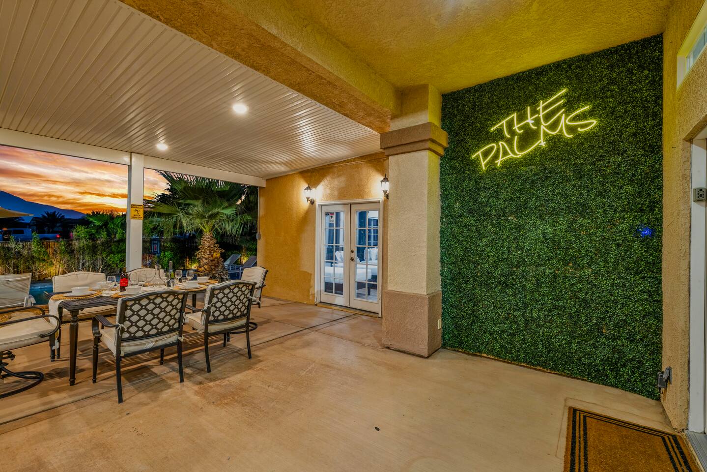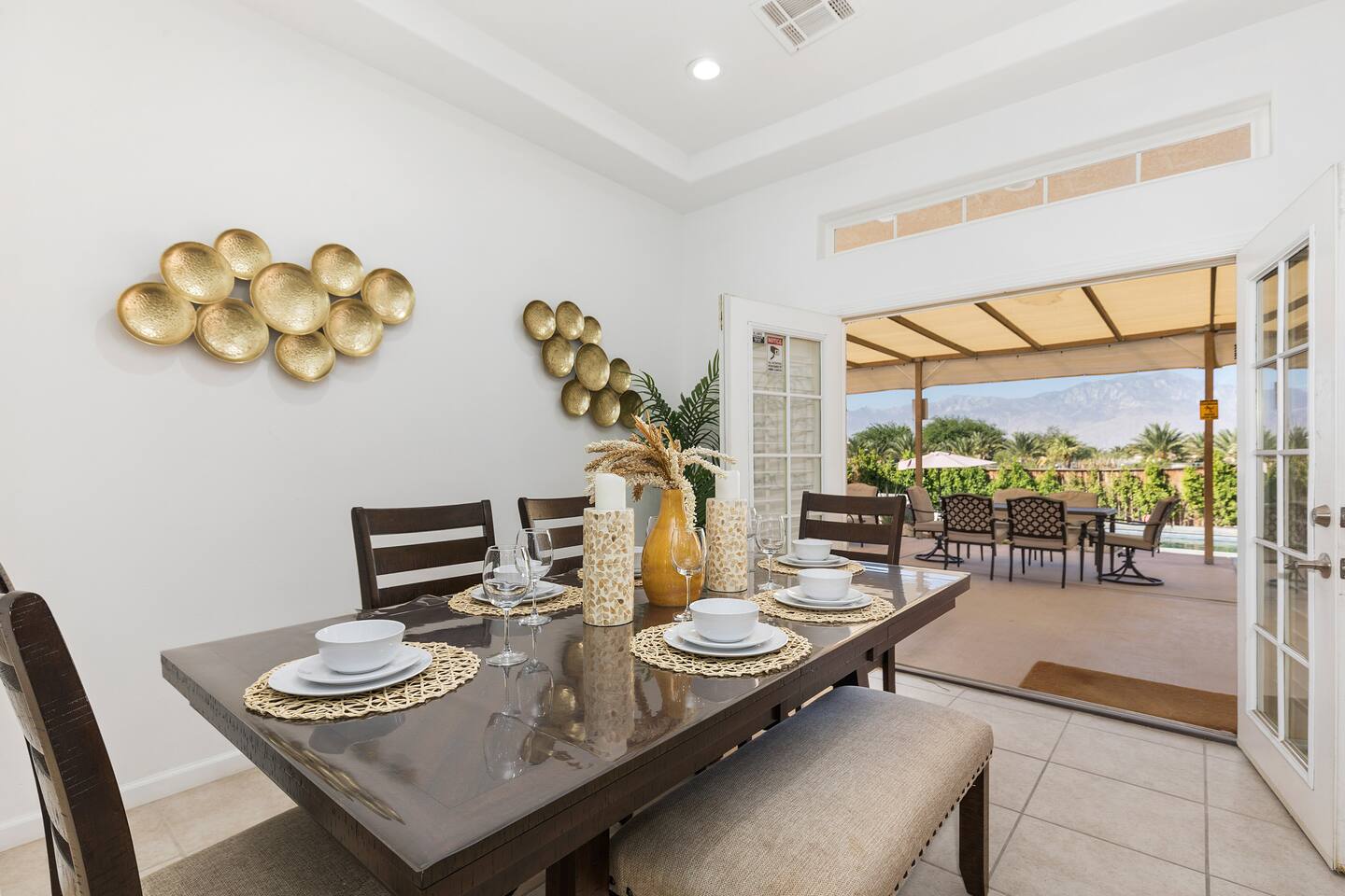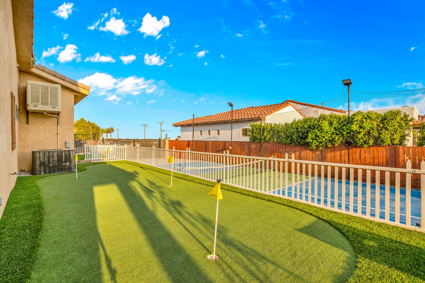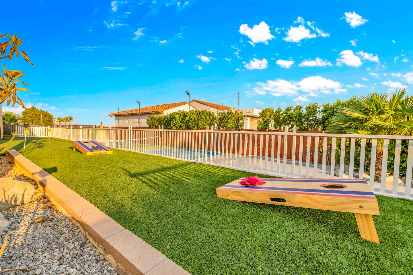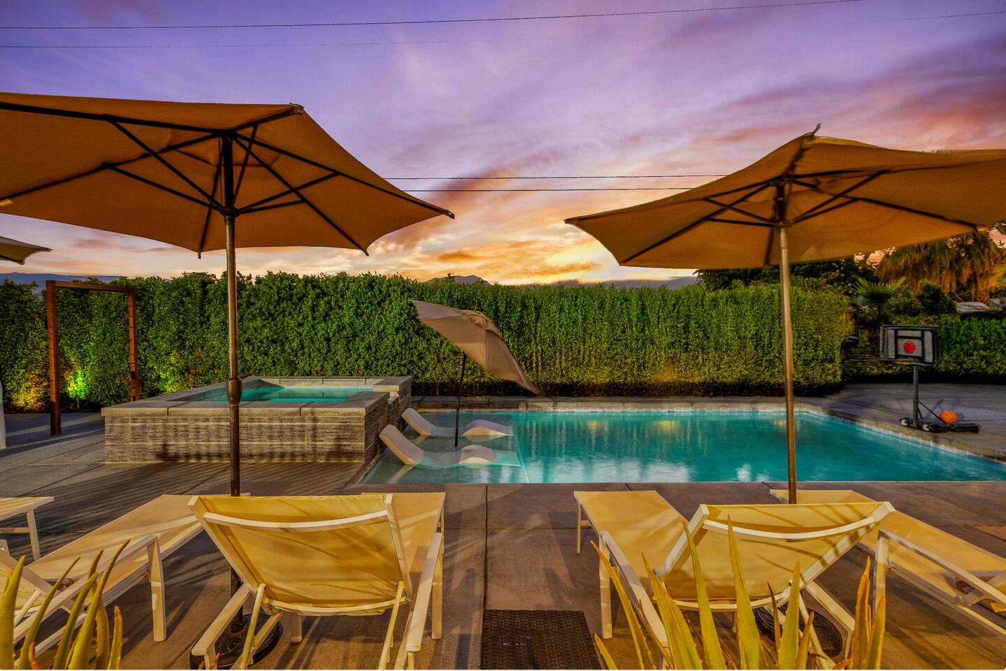 BACKYARD The new backyard includes a pool & spa, covered patio with an outdoor dining table, sofas, BBQ, hammock, firepit, basketball court, pickleball court, putting green, and other games. There are lots of activities to keep your party entertained all day and night. **PLEASE NOTE: The fee to heat the pool is $150/day. Please let us know at least 24 hours in advance of your arrival if you'd like the pool heated. Spa heating is complimentary. KITCHEN The kitchen is fully equipped with a standard ground coffee maker, tea kettle, toaster, blender, and everything you need to cook at home. Kitchen supplies included: coffee, sugar, tea, cooking oil, spices, and plenty of outdoor dinnerware. LIVING ROOM Enjoy an open-concept living room with a large comfortable couch to fit your party, a TV, and a sound bar to play your favorite music. BEDROOMS Please see details of each room below: 1 - 1 king bed, ensuite bathroom 2 - 1 king bed, ensuite bathroom, work-from-home desk 3 - 1 king bed 4 - 4 twin beds, ensuite bathroom + 2 twin folding beds BATHROOMS All three bathrooms include bath towels, hand towels, shampoo, conditioner, and body wash. Additional bath towels can be found under each bathroom sink. HOUSE RULES - No parties; violations will be notified to property manager and a $200 party clean up fee will be charged - Quiet hours start at 10:00 pm - 12 guests maximum - No glassware by the pool. We have provided ample outdoor drinkware, please use it! - We generally do not allow pets. Small dogs are ok for an additional $100 pet fee. Please reach out to hosts for approval - Turn off BBQ and Fire pit propane after each use - Lower umbrellas every day due to winds SECURITY CAMERAS For the safety of our property, we have outdoor security cameras facing the front driveway and front doorbell. These are live recordings and we do monitor. Please message us if you have any questions. This house is privately owned and managed; the owners assume no liability for any accidents, injuries or illness that occur while on the premises or its facilities. The homeowners are not responsible for the loss of personal belongings or valuables of the guest. It is agreed that all guests are expressly assuming the risk of any harm arising from their use of the premises. Guests should be aware that the pool and surrounding patios can be dangerous. Please note, while the house is cleaned regularly before and after each guest, this desert region is known for natural dust storms and strong winds from time to time. These winds may carry a lot of sand that may collect on outdoor furniture overnight. -Pet fee $150 for each entire stay -Pool heating is available for $150 per day.Plaese request at least 24 hours in advance. STR#: RVC-1573