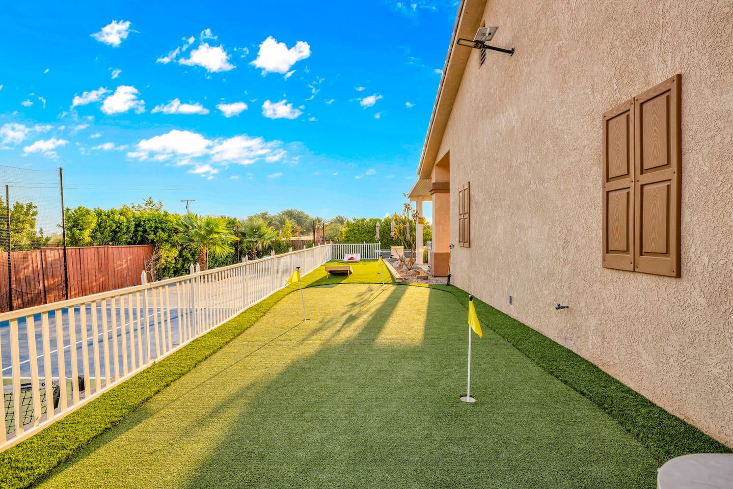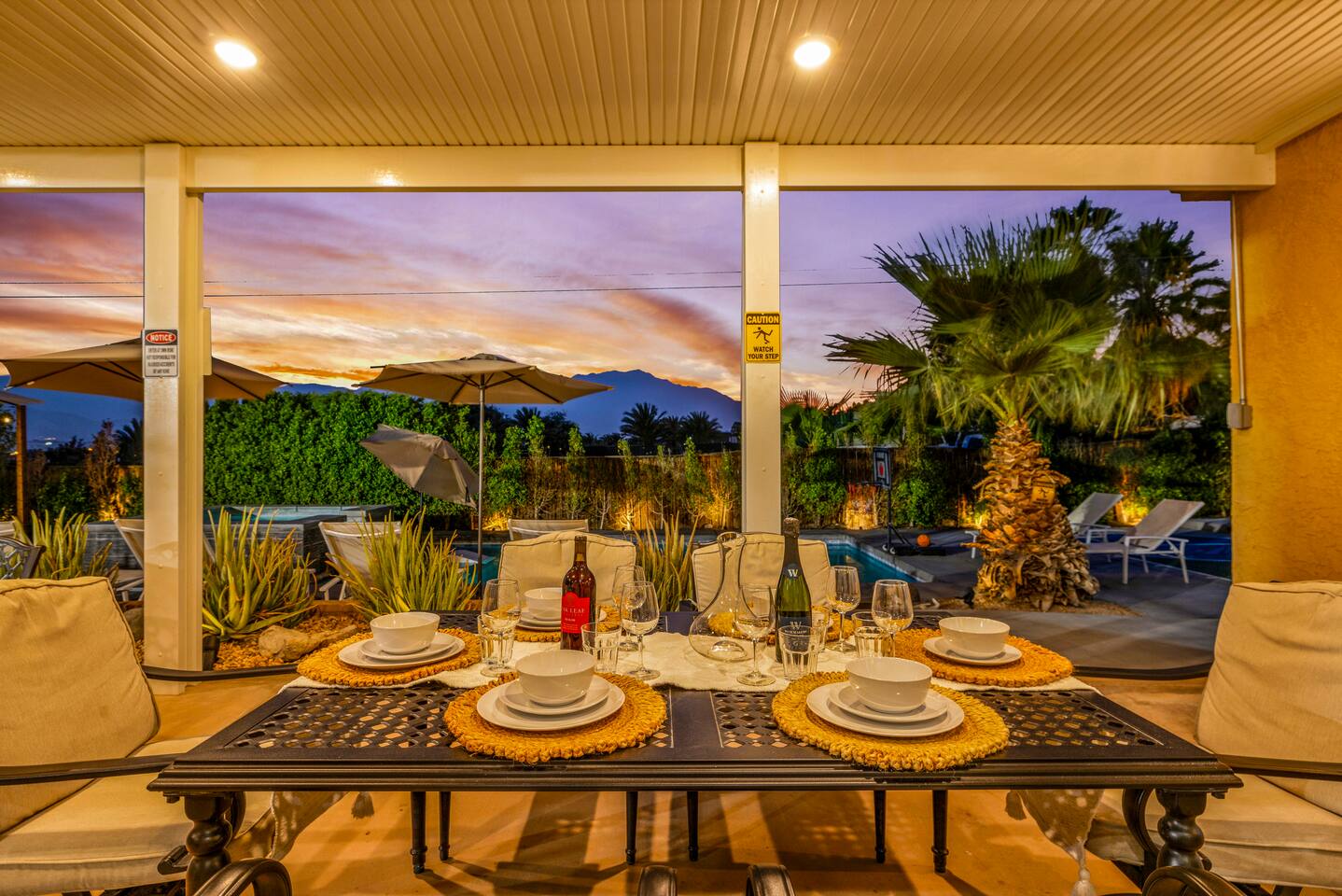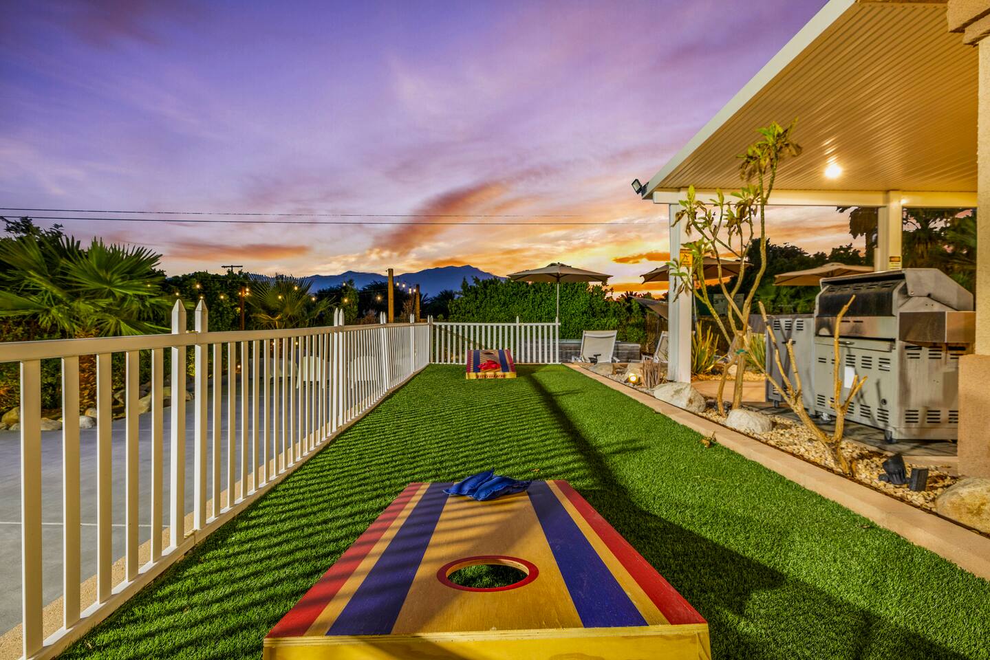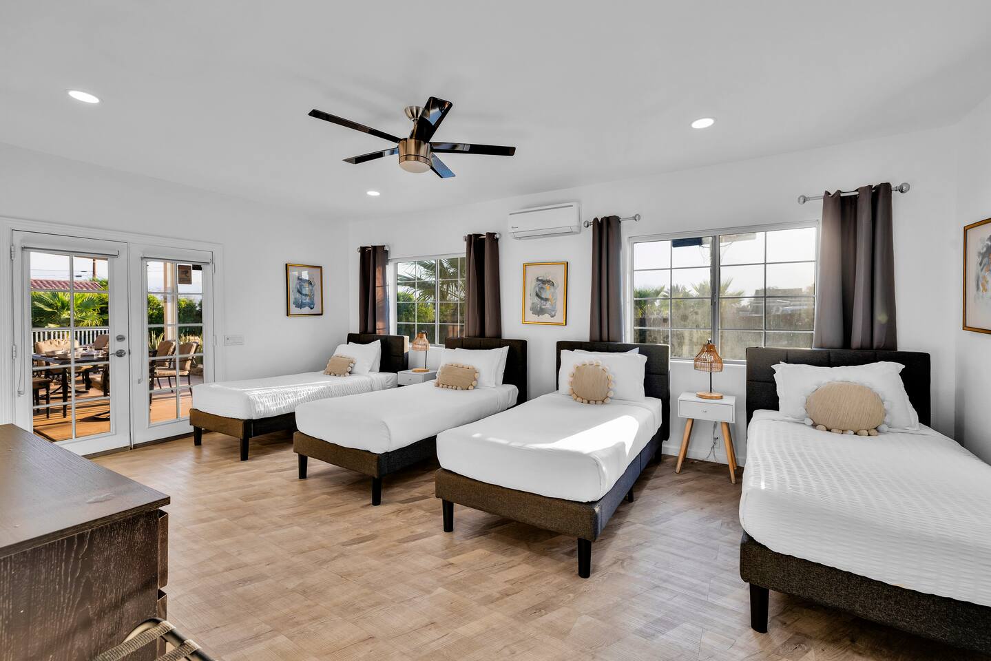 BACKYARD The new backyard includes a pool & spa, covered patio with an outdoor dining table, sofas, BBQ, hammock, firepit, basketball court, pickleball court, putting green, and other games. There are lots of activities to keep your party entertained all day and night. **PLEASE NOTE: The fee to heat the pool is $150/day. Please let us know at least 24 hours in advance of your arrival if you'd like the pool heated. Spa heating is complimentary. KITCHEN The kitchen is fully equipped with a standard ground coffee maker, tea kettle, toaster, blender, and everything you need to cook at home. Kitchen supplies included: coffee, sugar, tea, cooking oil, spices, and plenty of outdoor dinnerware. LIVING ROOM Enjoy an open-concept living room with a large comfortable couch to fit your party, a TV, and a sound bar to play your favorite music. BEDROOMS Please see details of each room below: 1 - 1 king bed, ensuite bathroom 2 - 1 king bed, ensuite bathroom, work-from-home desk 3 - 1 king bed 4 - 4 twin beds, ensuite bathroom + 2 twin folding beds BATHROOMS All three bathrooms include bath towels, hand towels, shampoo, conditioner, and body wash. Additional bath towels can be found under each bathroom sink. HOUSE RULES - No parties; violations will be notified to property manager and a $200 party clean up fee will be charged - Quiet hours start at 10:00 pm - 12 guests maximum - No glassware by the pool. We have provided ample outdoor drinkware, please use it! - We generally do not allow pets. Small dogs are ok for an additional $100 pet fee. Please reach out to hosts for approval - Turn off BBQ and Fire pit propane after each use - Lower umbrellas every day due to winds SECURITY CAMERAS For the safety of our property, we have outdoor security cameras facing the front driveway and front doorbell. These are live recordings and we do monitor. Please message us if you have any questions. This house is privately owned and managed; the owners assume no liability for any accidents, injuries or illness that occur while on the premises or its facilities. The homeowners are not responsible for the loss of personal belongings or valuables of the guest. It is agreed that all guests are expressly assuming the risk of any harm arising from their use of the premises. Guests should be aware that the pool and surrounding patios can be dangerous. Please note, while the house is cleaned regularly before and after each guest, this desert region is known for natural dust storms and strong winds from time to time. These winds may carry a lot of sand that may collect on outdoor furniture overnight. -Pet fee $150 for each entire stay -Pool heating is available for $150 per day.Plaese request at least 24 hours in advance. STR#: RVC-1573