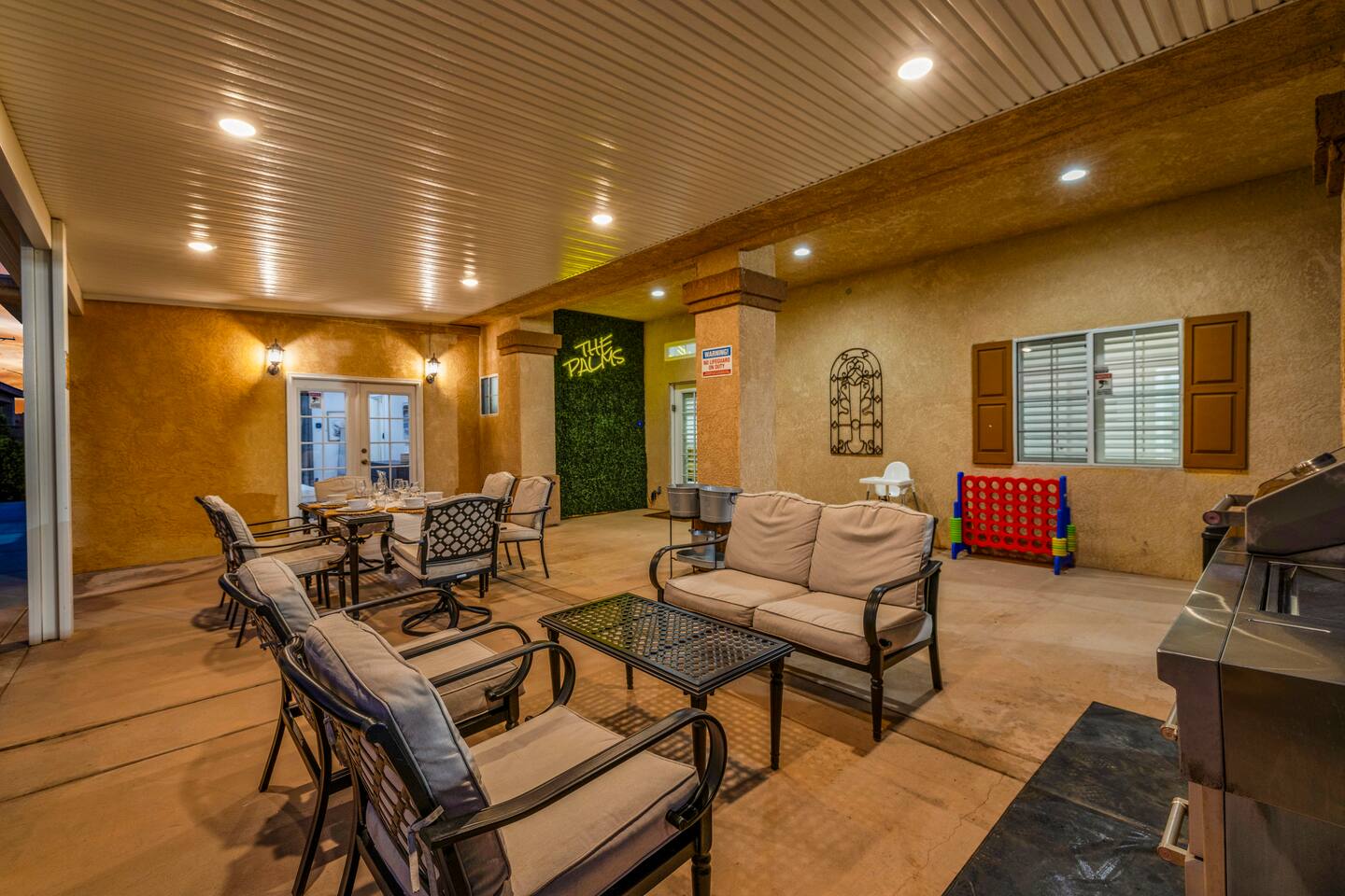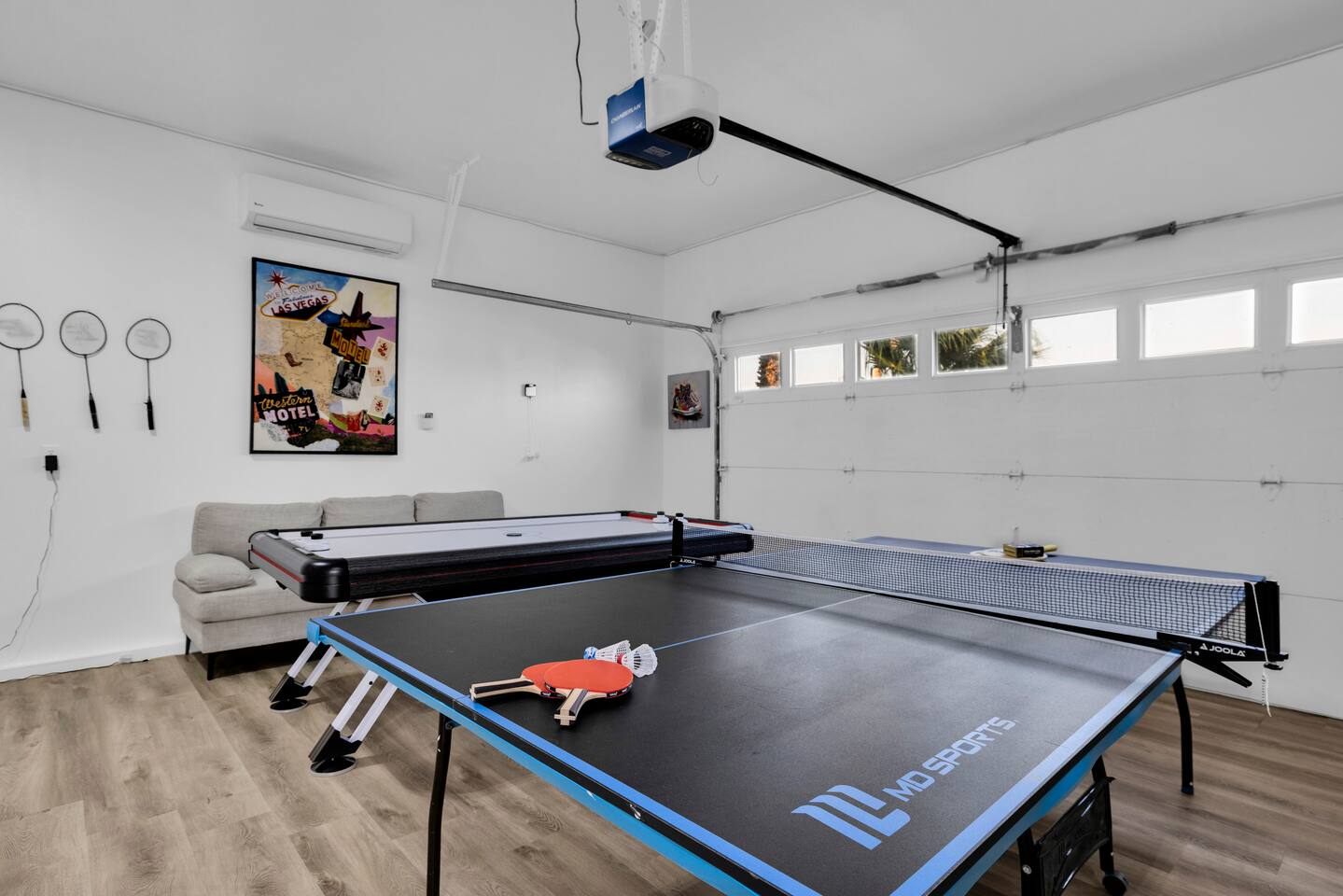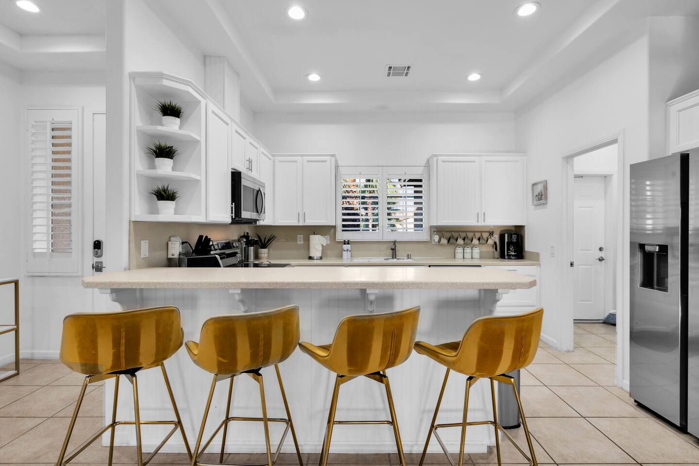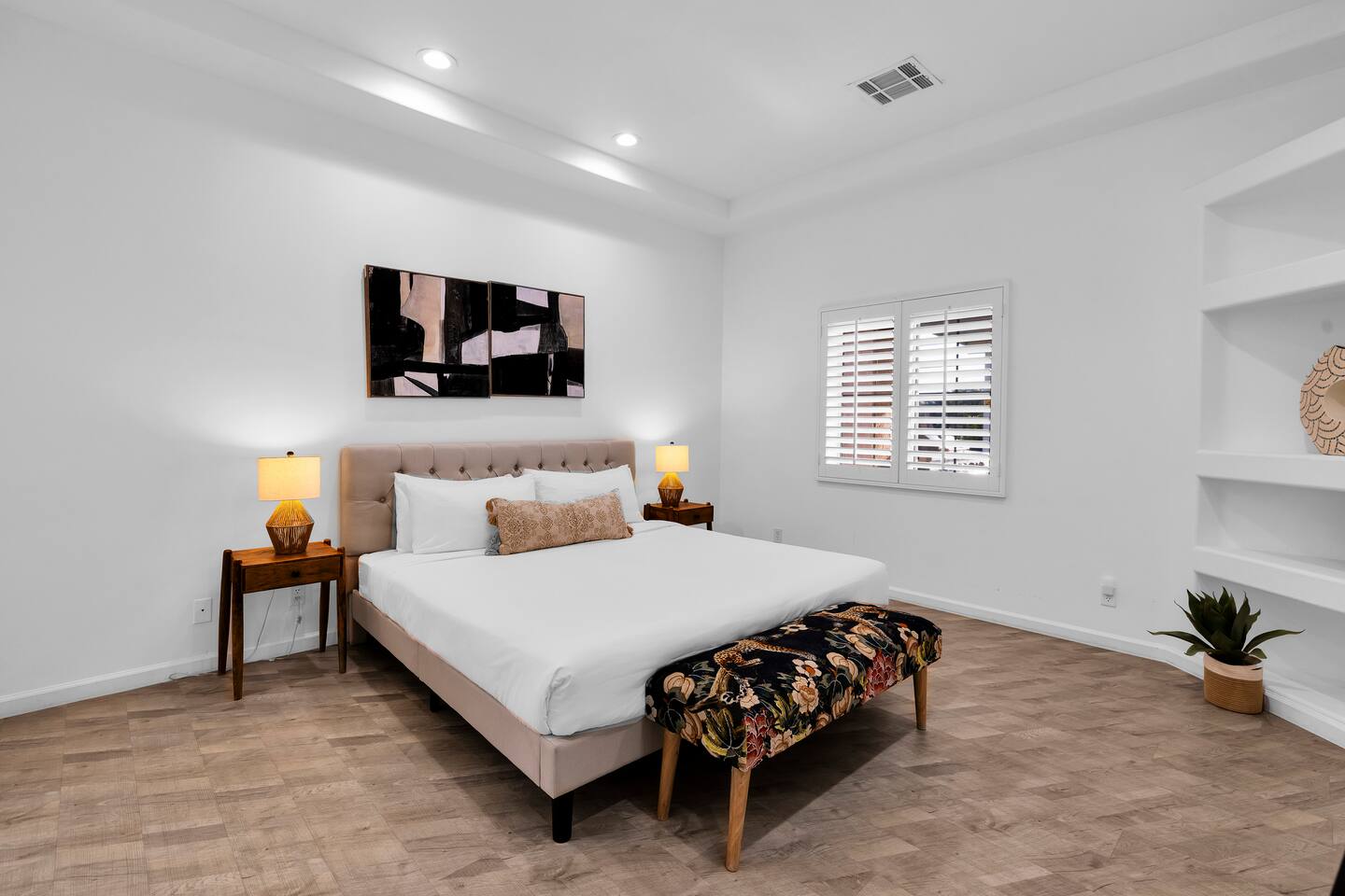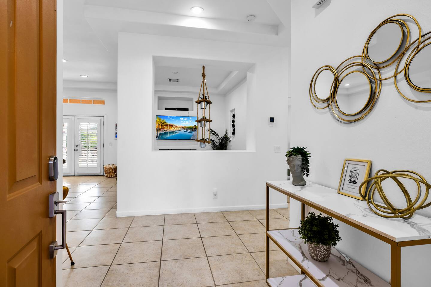 BACKYARD The new backyard includes a pool & spa, covered patio with an outdoor dining table, sofas, BBQ, hammock, firepit, basketball court, pickleball court, putting green, and other games. There are lots of activities to keep your party entertained all day and night. **PLEASE NOTE: The fee to heat the pool is $150/day. Please let us know at least 24 hours in advance of your arrival if you'd like the pool heated. Spa heating is complimentary. KITCHEN The kitchen is fully equipped with a standard ground coffee maker, tea kettle, toaster, blender, and everything you need to cook at home. Kitchen supplies included: coffee, sugar, tea, cooking oil, spices, and plenty of outdoor dinnerware. LIVING ROOM Enjoy an open-concept living room with a large comfortable couch to fit your party, a TV, and a sound bar to play your favorite music. BEDROOMS Please see details of each room below: 1 - 1 king bed, ensuite bathroom 2 - 1 king bed, ensuite bathroom, work-from-home desk 3 - 1 king bed 4 - 4 twin beds, ensuite bathroom + 2 twin folding beds BATHROOMS All three bathrooms include bath towels, hand towels, shampoo, conditioner, and body wash. Additional bath towels can be found under each bathroom sink. HOUSE RULES - No parties; violations will be notified to property manager and a $200 party clean up fee will be charged - Quiet hours start at 10:00 pm - 12 guests maximum - No glassware by the pool. We have provided ample outdoor drinkware, please use it! - We generally do not allow pets. Small dogs are ok for an additional $100 pet fee. Please reach out to hosts for approval - Turn off BBQ and Fire pit propane after each use - Lower umbrellas every day due to winds SECURITY CAMERAS For the safety of our property, we have outdoor security cameras facing the front driveway and front doorbell. These are live recordings and we do monitor. Please message us if you have any questions. This house is privately owned and managed; the owners assume no liability for any accidents, injuries or illness that occur while on the premises or its facilities. The homeowners are not responsible for the loss of personal belongings or valuables of the guest. It is agreed that all guests are expressly assuming the risk of any harm arising from their use of the premises. Guests should be aware that the pool and surrounding patios can be dangerous. Please note, while the house is cleaned regularly before and after each guest, this desert region is known for natural dust storms and strong winds from time to time. These winds may carry a lot of sand that may collect on outdoor furniture overnight. -Pet fee $150 for each entire stay -Pool heating is available for $150 per day.Plaese request at least 24 hours in advance. STR#: RVC-1573