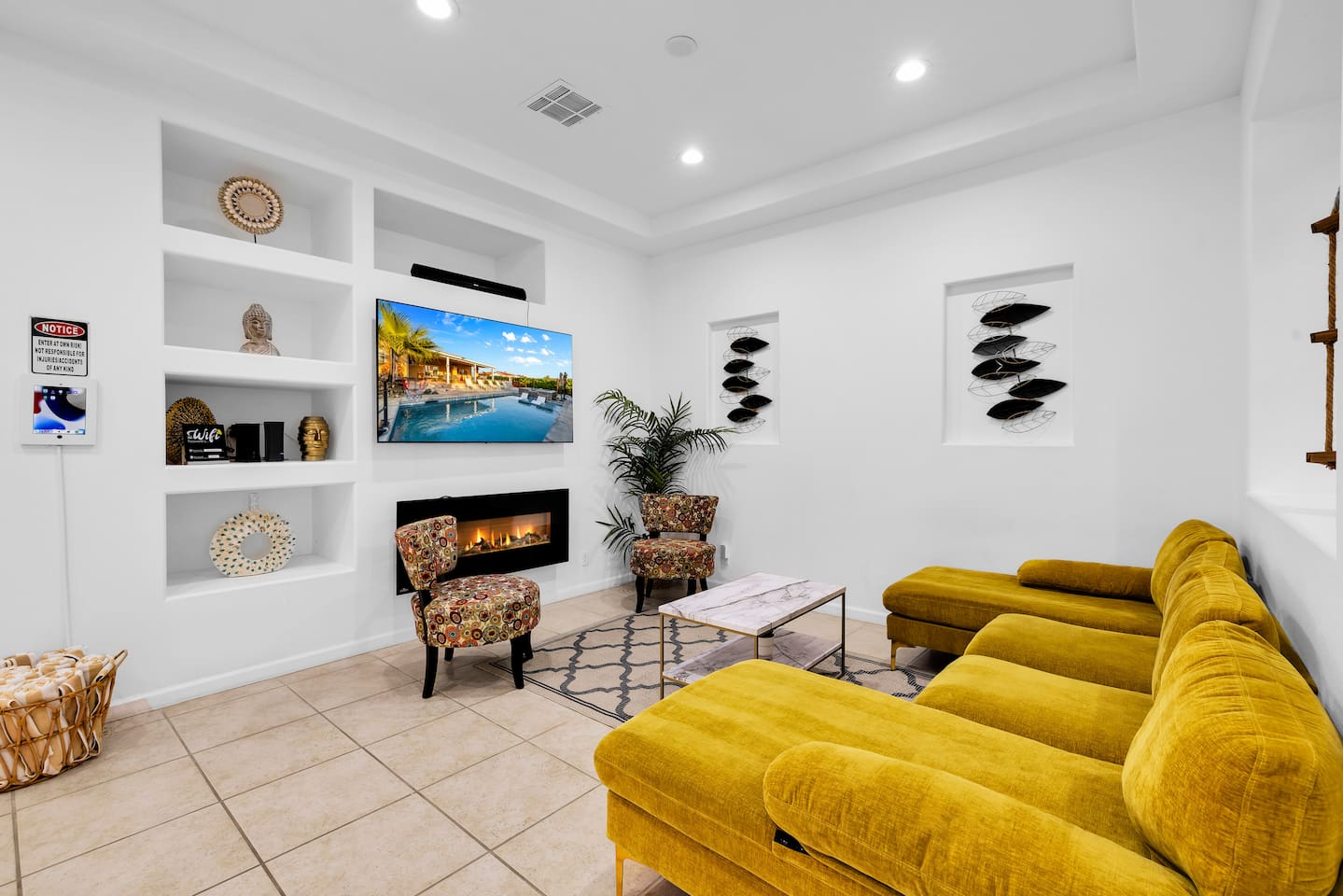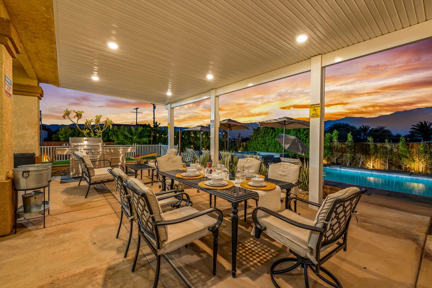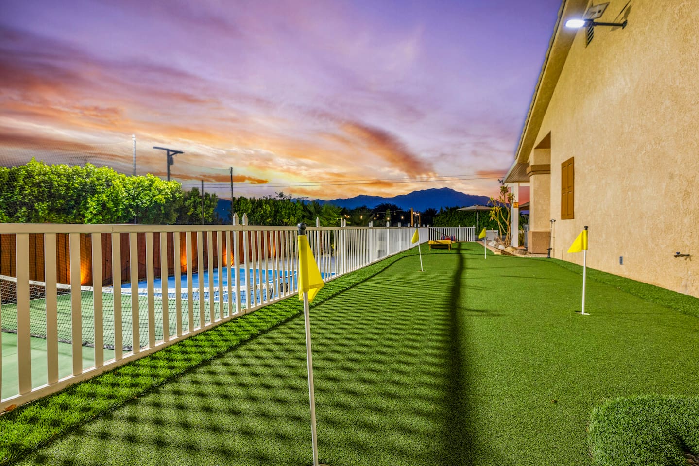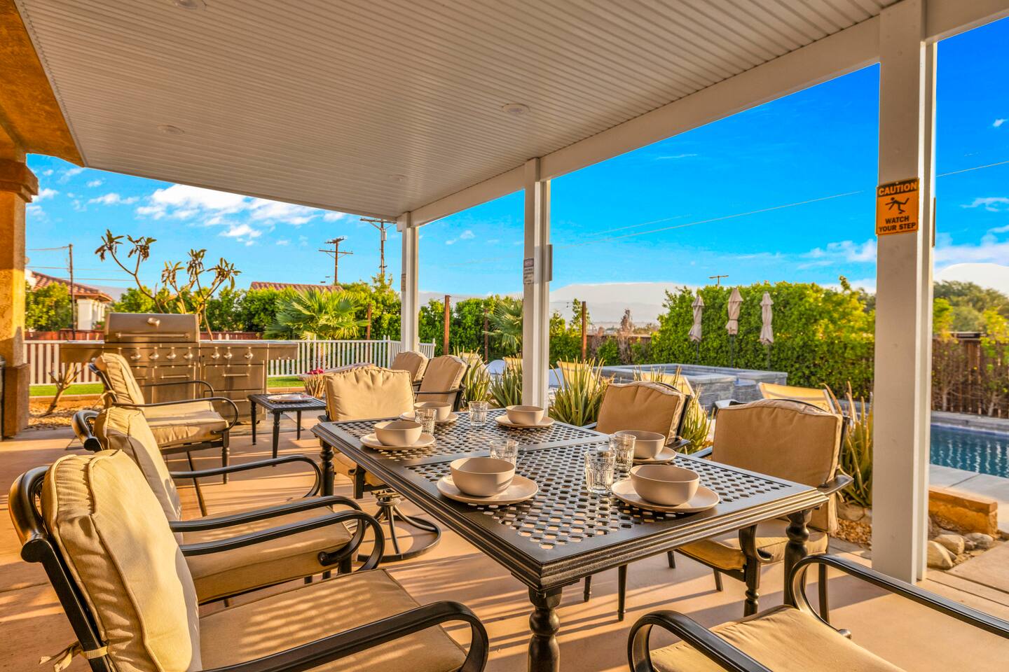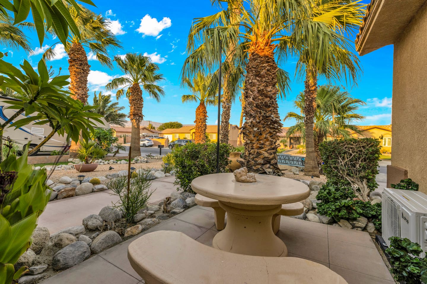 BACKYARD The new backyard includes a pool & spa, covered patio with an outdoor dining table, sofas, BBQ, hammock, firepit, basketball court, pickleball court, putting green, and other games. There are lots of activities to keep your party entertained all day and night. **PLEASE NOTE: The fee to heat the pool is $150/day. Please let us know at least 24 hours in advance of your arrival if you'd like the pool heated. Spa heating is complimentary. KITCHEN The kitchen is fully equipped with a standard ground coffee maker, tea kettle, toaster, blender, and everything you need to cook at home. Kitchen supplies included: coffee, sugar, tea, cooking oil, spices, and plenty of outdoor dinnerware. LIVING ROOM Enjoy an open-concept living room with a large comfortable couch to fit your party, a TV, and a sound bar to play your favorite music. BEDROOMS Please see details of each room below: 1 - 1 king bed, ensuite bathroom 2 - 1 king bed, ensuite bathroom, work-from-home desk 3 - 1 king bed 4 - 4 twin beds, ensuite bathroom + 2 twin folding beds BATHROOMS All three bathrooms include bath towels, hand towels, shampoo, conditioner, and body wash. Additional bath towels can be found under each bathroom sink. HOUSE RULES - No parties; violations will be notified to property manager and a $200 party clean up fee will be charged - Quiet hours start at 10:00 pm - 12 guests maximum - No glassware by the pool. We have provided ample outdoor drinkware, please use it! - We generally do not allow pets. Small dogs are ok for an additional $100 pet fee. Please reach out to hosts for approval - Turn off BBQ and Fire pit propane after each use - Lower umbrellas every day due to winds SECURITY CAMERAS For the safety of our property, we have outdoor security cameras facing the front driveway and front doorbell. These are live recordings and we do monitor. Please message us if you have any questions. This house is privately owned and managed; the owners assume no liability for any accidents, injuries or illness that occur while on the premises or its facilities. The homeowners are not responsible for the loss of personal belongings or valuables of the guest. It is agreed that all guests are expressly assuming the risk of any harm arising from their use of the premises. Guests should be aware that the pool and surrounding patios can be dangerous. Please note, while the house is cleaned regularly before and after each guest, this desert region is known for natural dust storms and strong winds from time to time. These winds may carry a lot of sand that may collect on outdoor furniture overnight. -Pet fee $150 for each entire stay -Pool heating is available for $150 per day.Plaese request at least 24 hours in advance. STR#: RVC-1573