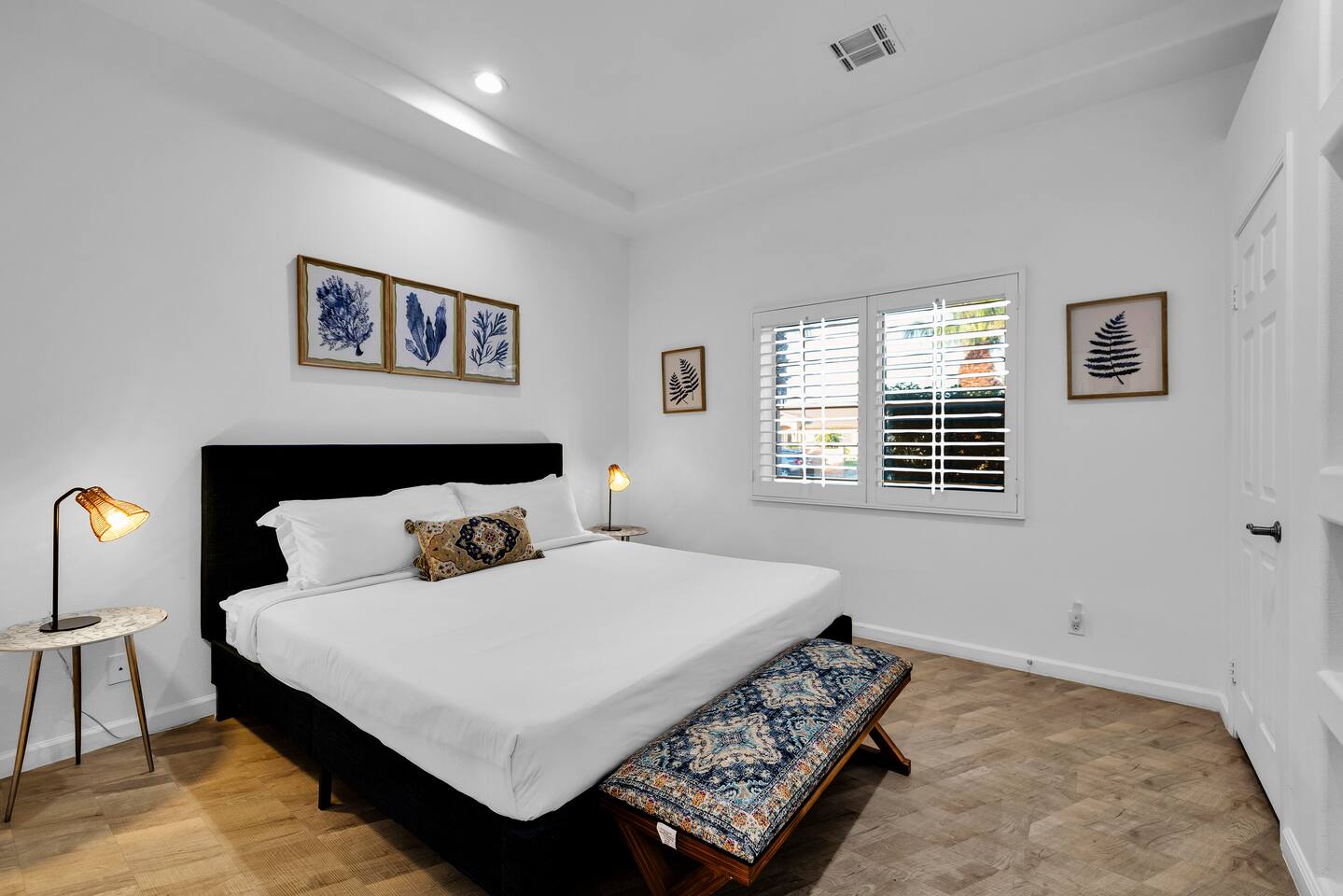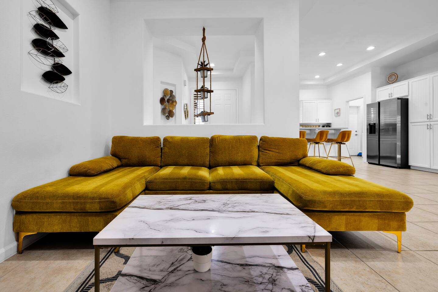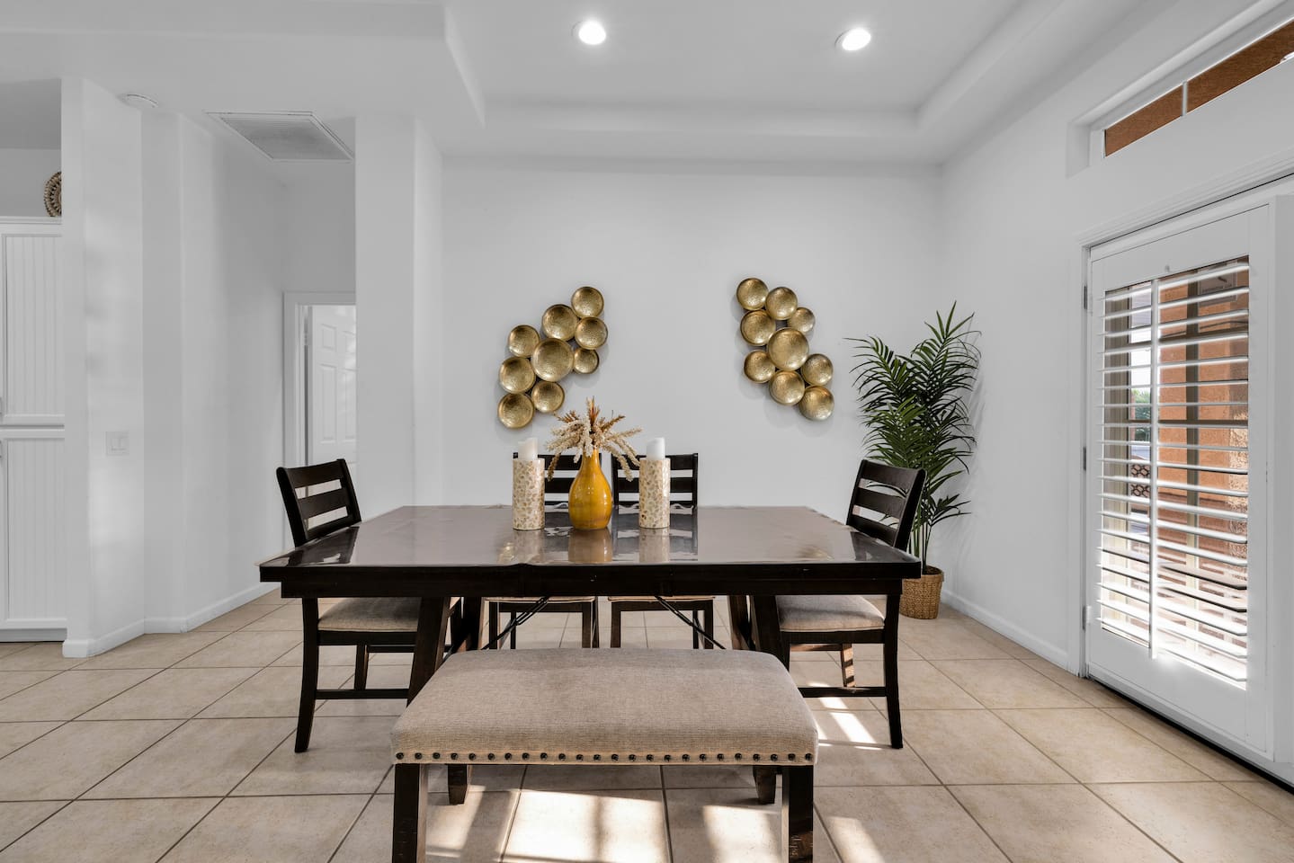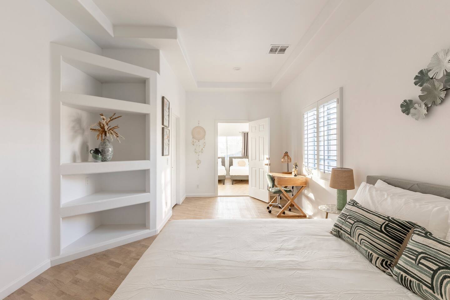 BACKYARD The new backyard includes a pool & spa, covered patio with an outdoor dining table, sofas, BBQ, hammock, firepit, basketball court, pickleball court, putting green, and other games. There are lots of activities to keep your party entertained all day and night. **PLEASE NOTE: The fee to heat the pool is $150/day. Please let us know at least 24 hours in advance of your arrival if you'd like the pool heated. Spa heating is complimentary. KITCHEN The kitchen is fully equipped with a standard ground coffee maker, tea kettle, toaster, blender, and everything you need to cook at home. Kitchen supplies included: coffee, sugar, tea, cooking oil, spices, and plenty of outdoor dinnerware. LIVING ROOM Enjoy an open-concept living room with a large comfortable couch to fit your party, a TV, and a sound bar to play your favorite music. BEDROOMS Please see details of each room below: 1 - 1 king bed, ensuite bathroom 2 - 1 king bed, ensuite bathroom, work-from-home desk 3 - 1 king bed 4 - 4 twin beds, ensuite bathroom + 2 twin folding beds BATHROOMS All three bathrooms include bath towels, hand towels, shampoo, conditioner, and body wash. Additional bath towels can be found under each bathroom sink. HOUSE RULES - No parties; violations will be notified to property manager and a $200 party clean up fee will be charged - Quiet hours start at 10:00 pm - 12 guests maximum - No glassware by the pool. We have provided ample outdoor drinkware, please use it! - We generally do not allow pets. Small dogs are ok for an additional $100 pet fee. Please reach out to hosts for approval - Turn off BBQ and Fire pit propane after each use - Lower umbrellas every day due to winds SECURITY CAMERAS For the safety of our property, we have outdoor security cameras facing the front driveway and front doorbell. These are live recordings and we do monitor. Please message us if you have any questions. This house is privately owned and managed; the owners assume no liability for any accidents, injuries or illness that occur while on the premises or its facilities. The homeowners are not responsible for the loss of personal belongings or valuables of the guest. It is agreed that all guests are expressly assuming the risk of any harm arising from their use of the premises. Guests should be aware that the pool and surrounding patios can be dangerous. Please note, while the house is cleaned regularly before and after each guest, this desert region is known for natural dust storms and strong winds from time to time. These winds may carry a lot of sand that may collect on outdoor furniture overnight. -Pet fee $150 for each entire stay -Pool heating is available for $150 per day.Plaese request at least 24 hours in advance. STR#: RVC-1573